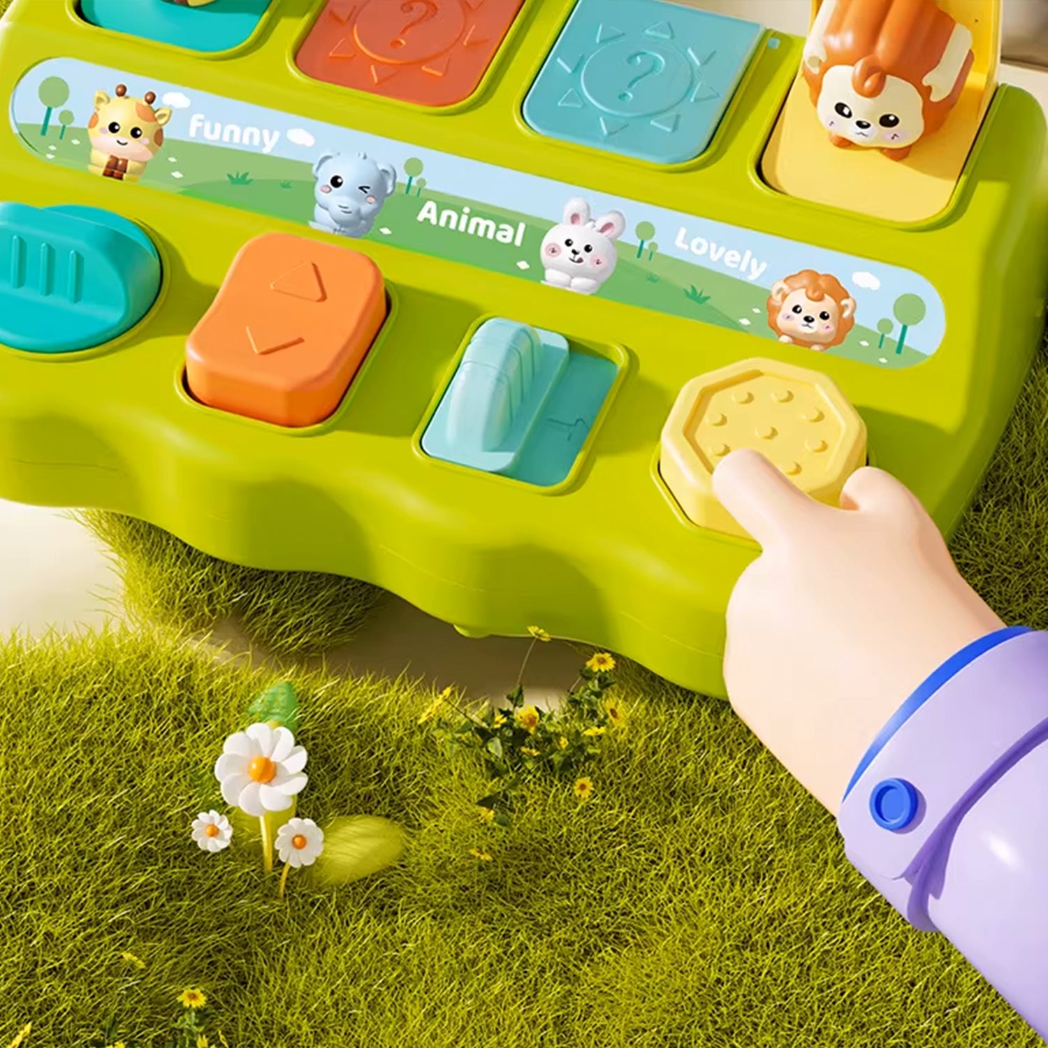 Early childhood educational and developmental toy for infants and toddlers: Peek-a-boo pop-up mechanism switch.