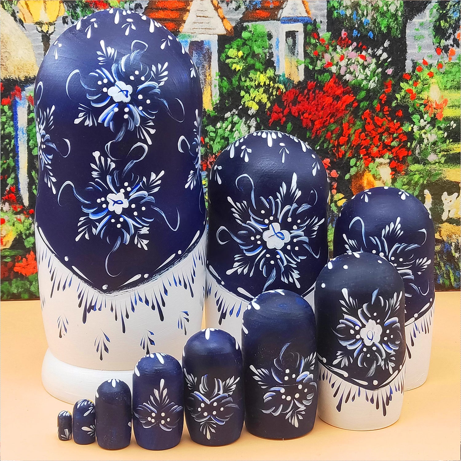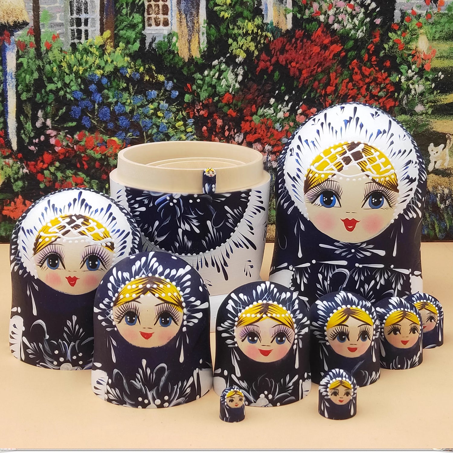 Russian nesting dolls, 10 layers, snow girl design, hand-painted linden wood dolls.